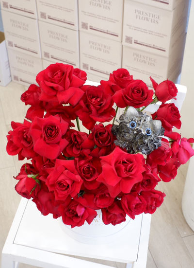 รายละเอียด: ชุดกล่องกลม ประกอบด้วย ดอกกุหลาบตาข่ายแดง 30 ดอก, ดอกกุหลาบพวงแดง, ดอกสเปย์คาเนชั่นแดง และแว็ก พร้อมน้องหมาที่ทำจากคาร์เนชั่น จำนวน 1 ตัว